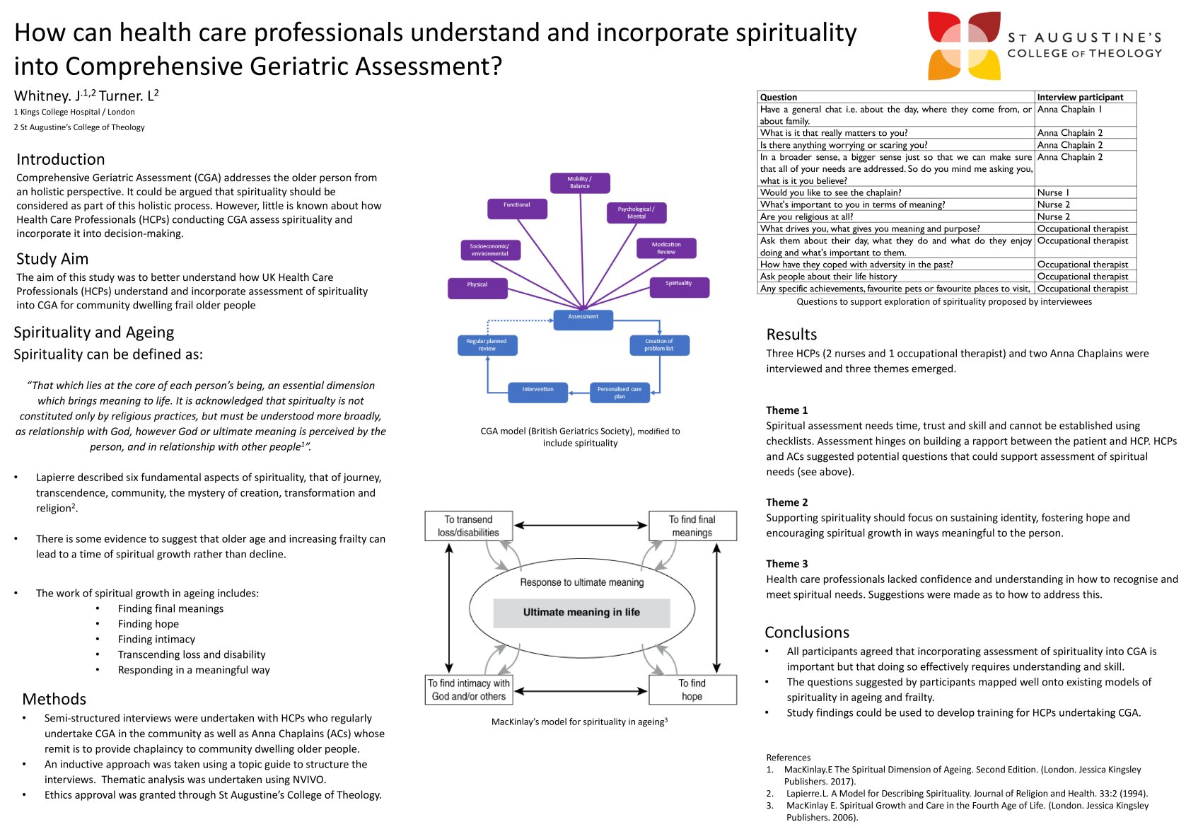 Semi-structured interviews were undertaken with HCPs who regularly undertake CGA in the community as well as Anna Chaplains (ACs) whose remit is to provide chaplaincy to community dwelling older people. An inductive approach was taken using a topic guide to structure the interviews. Thematic analysis was undertaken using NVIVO. Ethics approval was granted through St Augustine’s College of Theology.