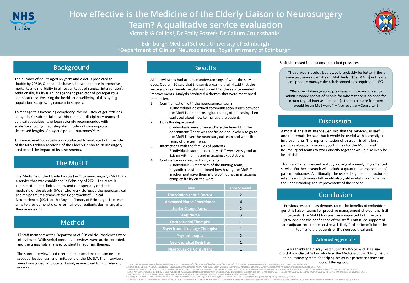 Almost all staff found the service useful. They emphasised that the MoELT communicated excellently with the families of patients and described improved confidence managing frailty with the team on the ward. The identified issues were related to occasional communication problems between the MoELT and the neurosurgical teams, and some misunderstandings of the remit of the MoELT itself. While these problems were raised, the interviewed staff indicated that they would welcome education, signposting, and a streamlined referral process to address this.