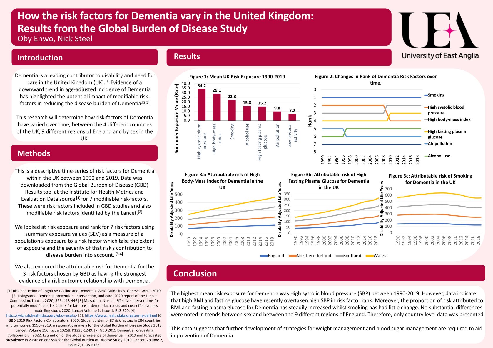 Dementia is one of the leading contributors of disability in the UK. Evidence of a downward trend in age-adjusted incidence of Dementia has highlighted the potential impact of modifiable risk-factors in reducing the disease burden of Dementia. This research will determine how risk-factors of Dementia have varied over time, between the different countries of the UK, the different regions of England and by sex in the UK.