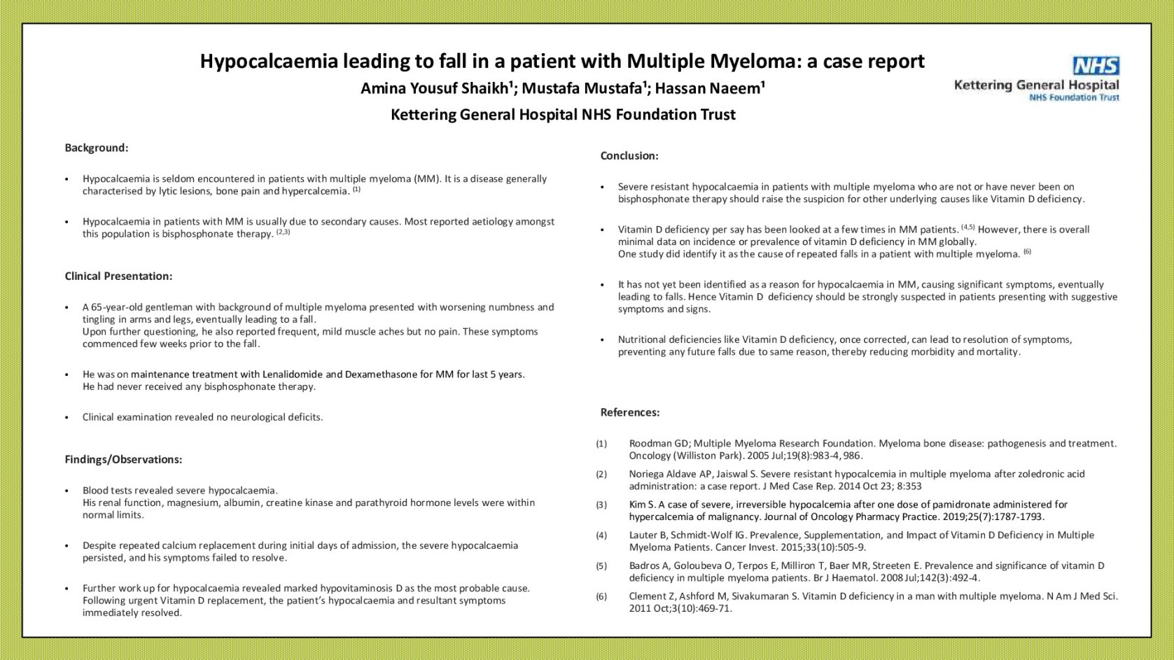 Severe resistant hypocalcemia in patients with multiple myeloma who are not or have never been on bisphosphonate therapy should raise the suspicion for other causes. Nutritional deficiencies like Vitamin D deficiency, once corrected, can lead to resolution of symptoms, preventing any future falls due to same reason, thereby reducing morbidity and mortality.