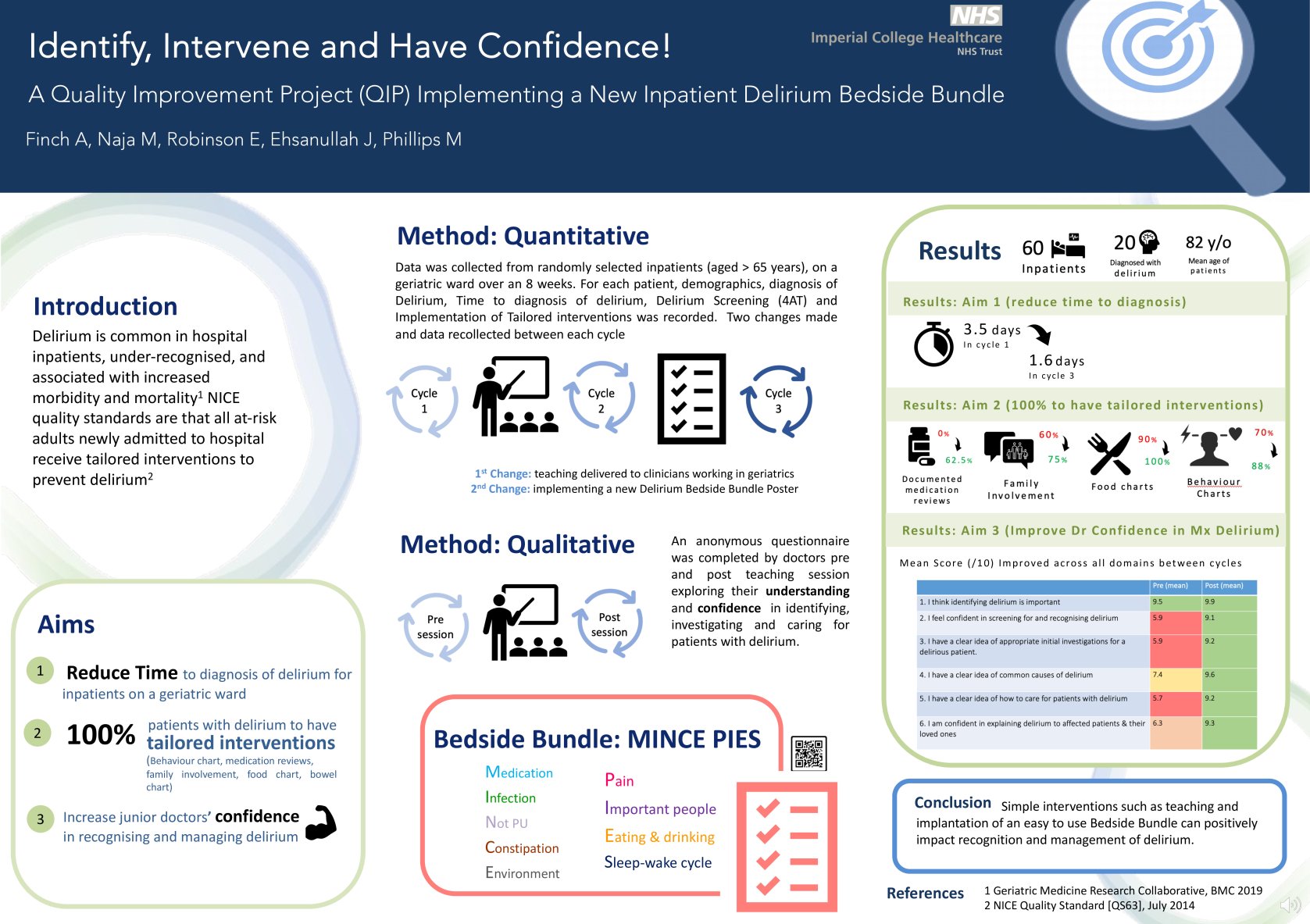Methods: Two changes were implemented and three cycles of data from inpatients on the geriatric wards were collected over an 8 week period. Qualitative data was also collected from doctors. The first change was teaching delivered to clinicians working in geriatrics. The second was implementing a new Delirium Bedside Bundle which was advertised in posters on the geriatrics wards.