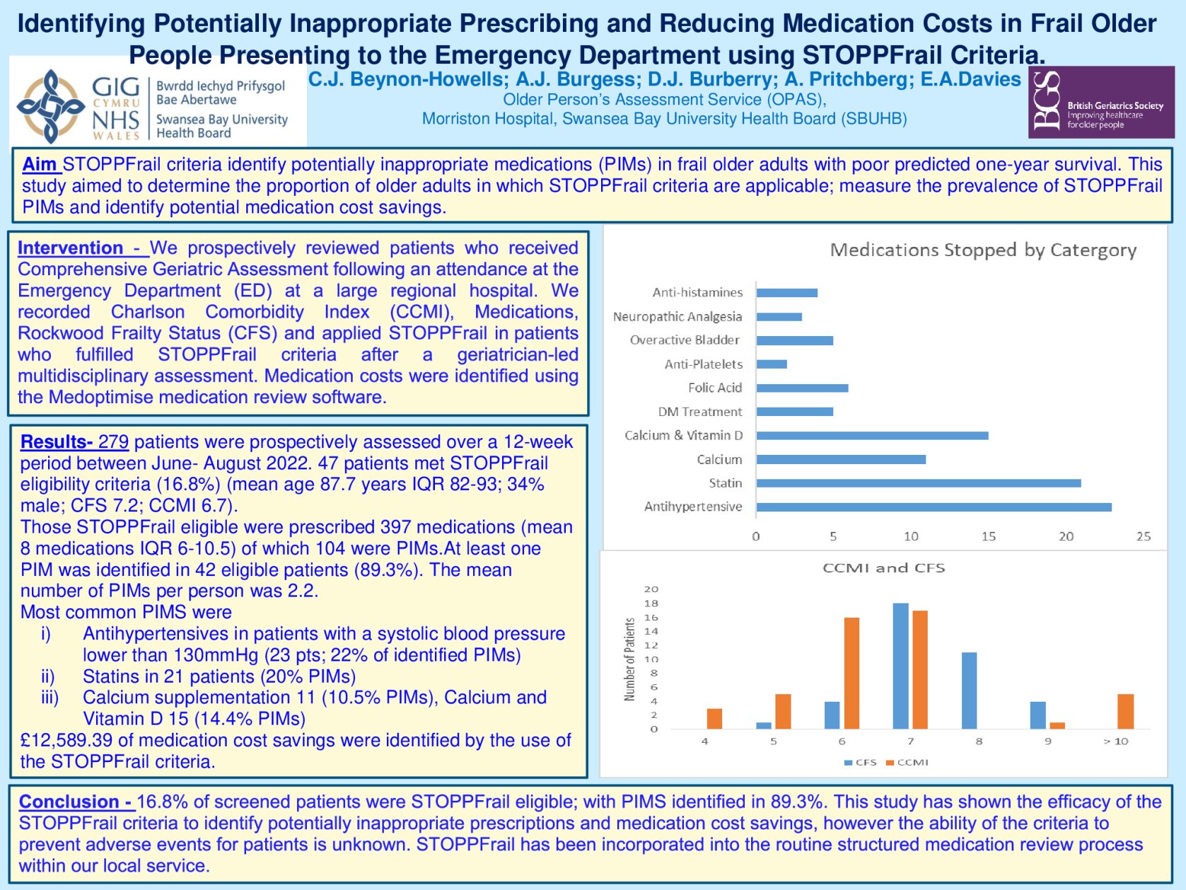 279 patients were prospectively assessed over a 12 week period between June- August 2022. 47 patients met STOPPFrail eligibility criteria (16.8%) ( mean age 87.7 yrs IQR 82-93; 34% male; CFS 7.2; CCI 6.7). Those STOPPFrail eligible were prescribed 397 medications (mean of 8 medications IQR 6-10.5) of which 104 were PIMs. At least one PIM was identified in 42 eligible patients (89.3%). The mean number of PIMs per person was 2.2. Most common PIMS were i) Antihypertensives in patients with a systolic blood pressure lower than 130mmHg (23 patients;22% of identified PIMs) ii) statins in 21 patients ( 20% of PIMs) and Calcium and Vitamin D supplementation 11 (10.5%) and 15 (14.4%) PIMs respectively. £12,589.39 of medication cost savings were identified by the use of the STOPPFrail criteria.