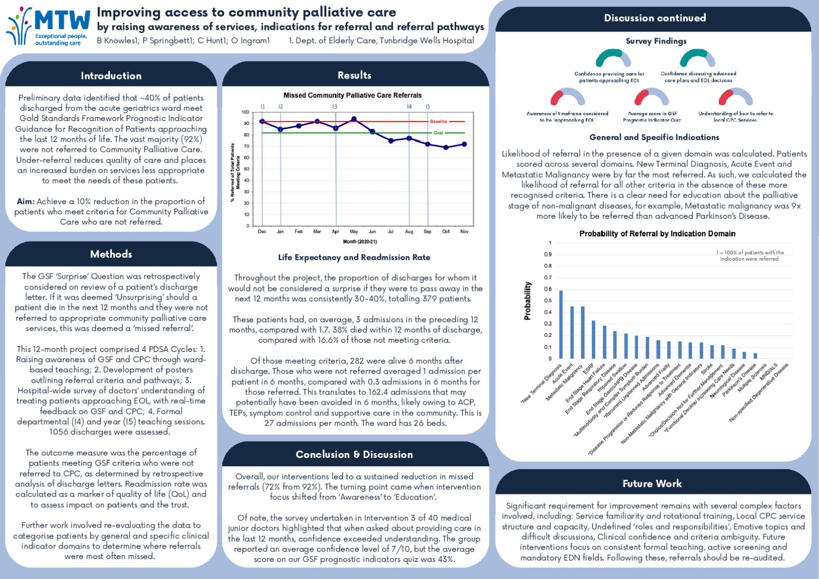 Highlighting the missed referral rate enabled engagement of key stakeholders including ward and palliative care multidisciplinary teams. This 12-month project comprised four PDSA Cycles: 1. Raising awareness of GSF and CPC through ward-based teaching; 2. Development of posters outlining referral criteria and pathways; 3. Hospital-wide survey of doctors’ understanding of treating patients approaching EOL, with real-time feedback on GSF and CPC; 4. Formal departmental and year-group teaching sessions. The outcome measure was the percentage of patients meeting GSF criteria who were not referred to CPC, as determined by retrospective analysis of discharge letters. Readmission rate was calculated as a marker of quality of life (QoL) and to assess the impact of missed referrals on the Trust.