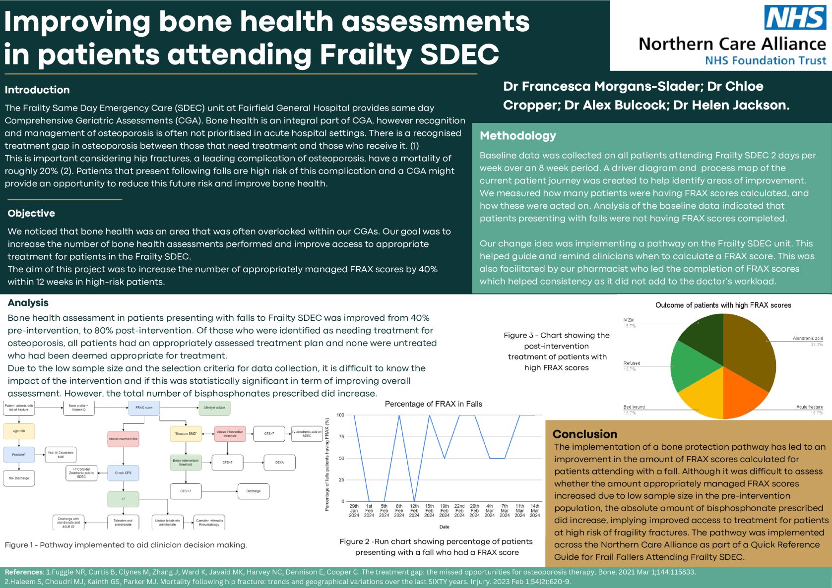 Conclusion: The implementation of a bone protection pathway has led to an improvement in the amount of FRAX scores calculated for patients attending with a fall. Our pathway was implemented across the Northern Care Alliance as part of a Quick Reference Guide for Frail Fallers Attending Frailty SDEC.