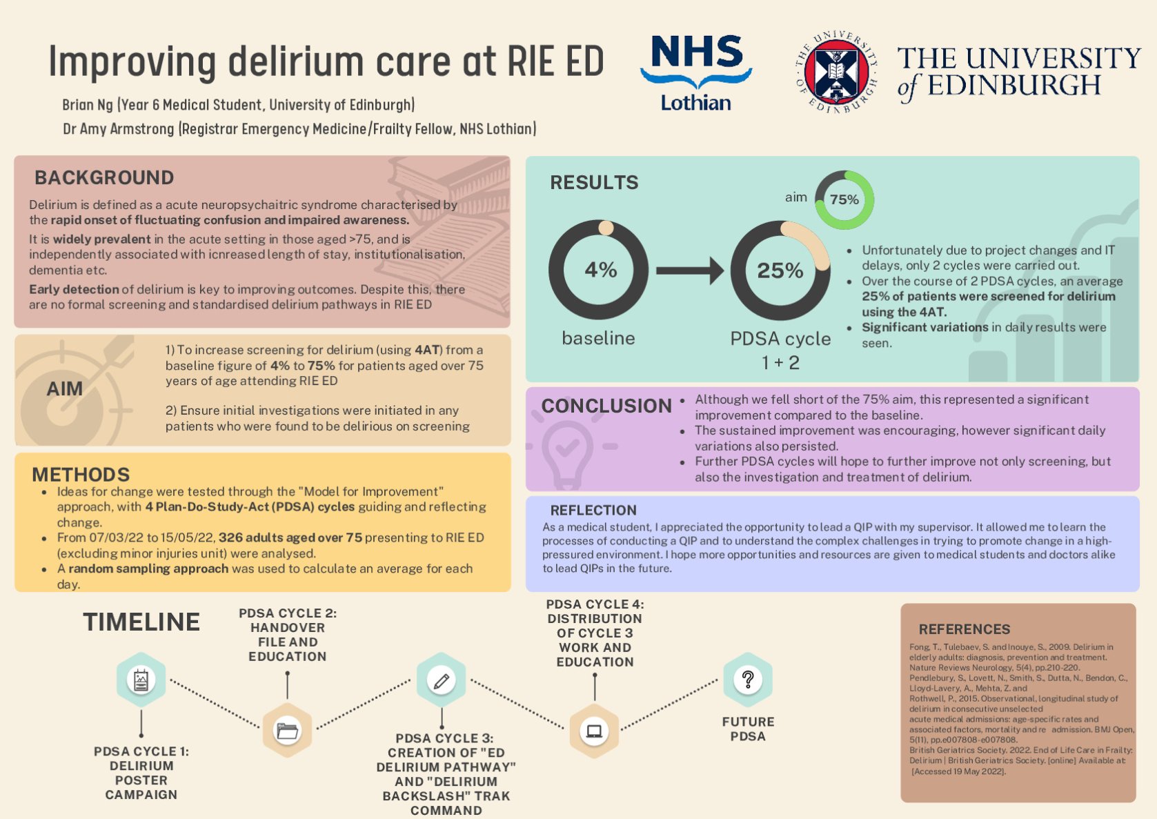 Introduction: Delirium is a neuropsychiatric condition which is independently associated with poorer outcomes, and is prevalent in those aged over 75. Early recognition and standardised pathways are key to delivering good delirium care. Despite this, there are no formal screening and standardised pathways in RIE ED. Baseline data suggested around 4% are being screened for delirium.