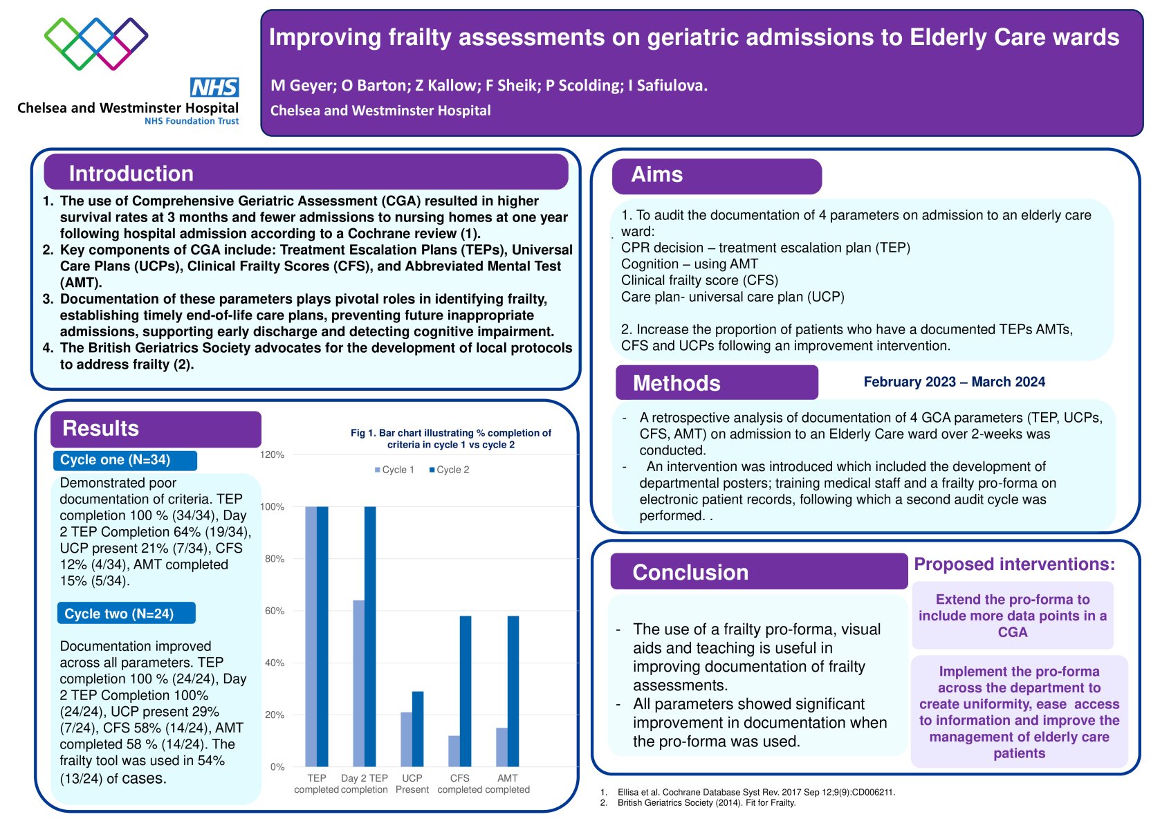 A retrospective analysis of documentation of 4 GCA parameters (TEP, UCPs, CFS, AMT) on admission to an Elderly Care ward over 2-weeks was conducted. An intervention was introduced which included the development of departmental posters; training medical staff and a frailty proforma, following which a second audit cycle was performed.