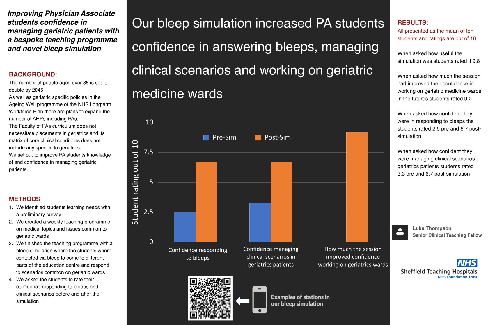 BGS reports in its 'Case for more Geriatricians' that the number of people age over 85 is set to double by 2045. As well as Geriatric specific policies in the Ageing Well programme of the NHS Longterm Workforce Plan there are plans to expand the number of allied health professionals including Physician Associates (PA). We set out to improve PA students knowledge of and confidence in managing geriatric patients with a bespoke teaching programme culminating in a novel bleep simulation.