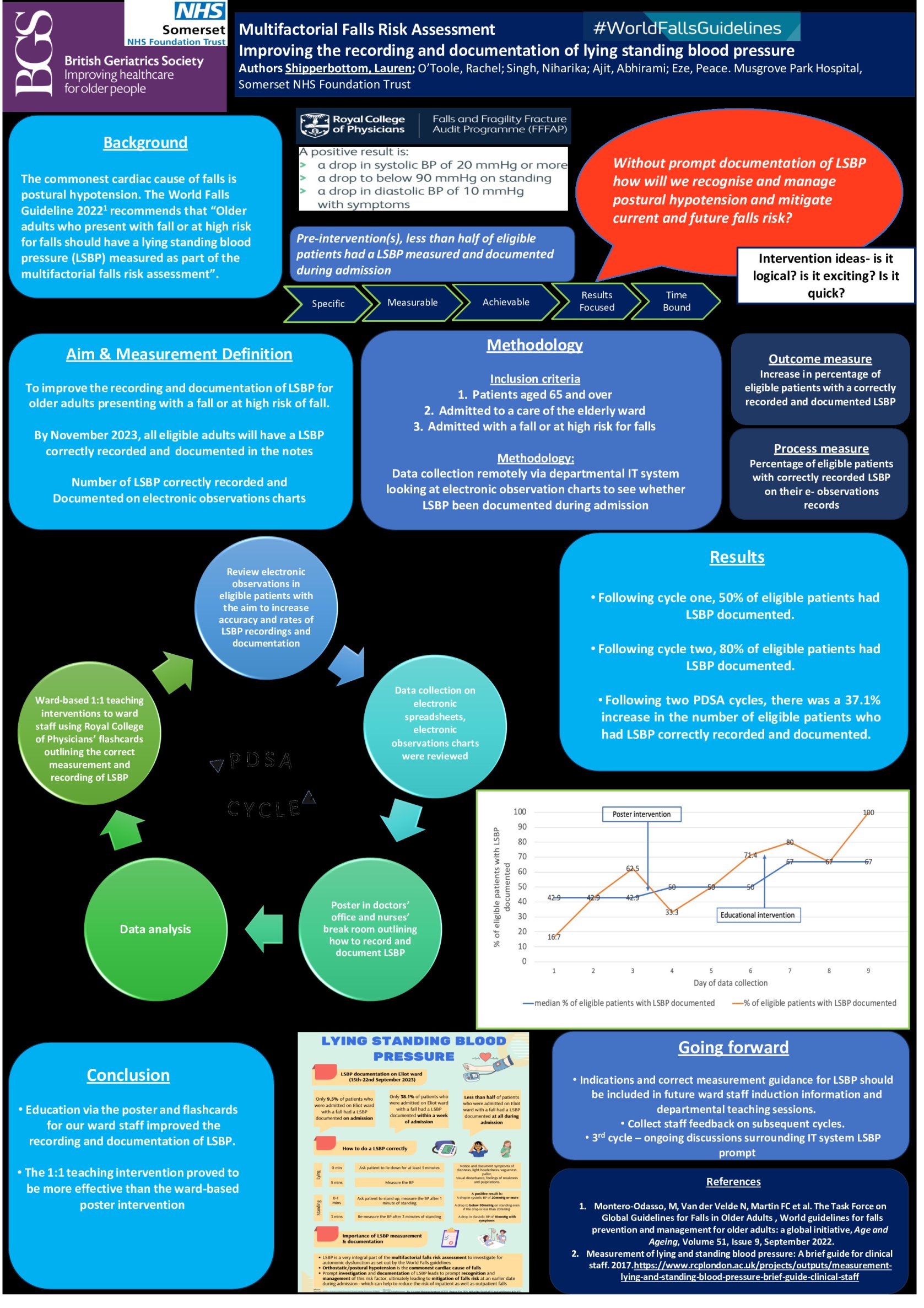 Introduction: The World Falls Guideline 2022 recommends that measurement of lying-standing blood pressure (LSBP) is an integral part of the multifactorial falls risk assessment (1). Pre-intervention less than half of eligible patients had a LSBP recorded and documented. The aim was to improve the recording and documentation of LSBP for adults aged 65 and over admitted with a fall or at high risk for falls. Method: All patients aged 65 and over admitted with a fall or identified as at high risk for falls to a care of the elderly ward were included over the period of 15th September 2023-15th November 2023. Royal College of Physicians (RCP) guidance (2017) for standard measurement of LSBP was used (2). Data was collected on electronic spreadsheets from electronic observation charts. Two plan-do-study-act (PDSA) cycles were conducted. Firstly, ward posters demonstrated how to record and document LSBP. Secondly, ward-based one-to-one teaching interventions using RCP LSBP lanyard flashcards (2) were conducted. Results: Following cycle one, 50% of eligible patients had LSBP documented. Following cycle two, 80% of eligible patients had LSBP documented. Following two PDSA cycles, there was a 37.1% increase in the average number of eligible patients who had LSBP correctly recorded and documented. Conclusion(s): Interventions of aide memoirs and education for nursing and medical staff improved the recording and documentation of LSBP. Indications and correct measurement guidance for LSBP should be included in future ward staff induction information and departmental teaching sessions.