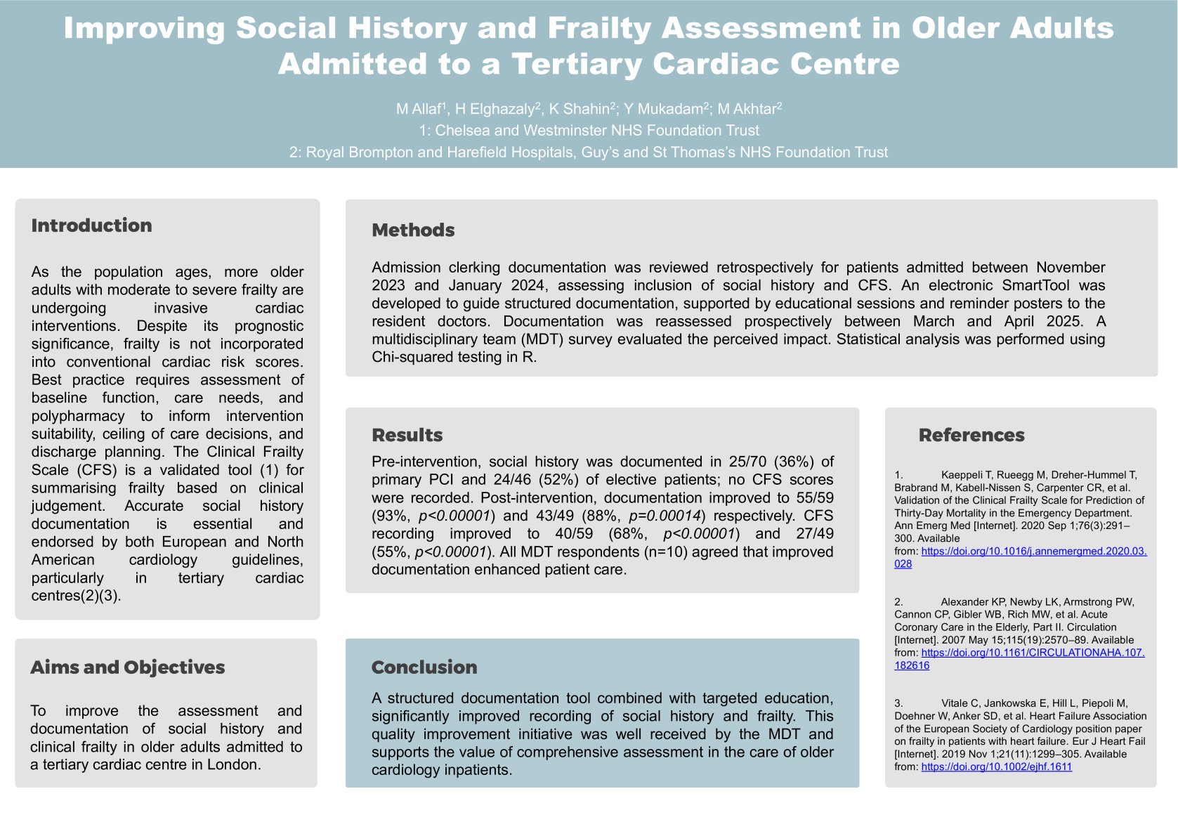 Pre-intervention, social history was documented in 25/70 (36%) of primary PCI and 24/46 (52%) of elective patients; no CFS scores were recorded. Post-intervention, documentation improved to 55/59 (93%, p<0.00001) and 43/49 (88%, p=0.00014) respectively. CFS recording improved to 40/59 (68%, p<0.00001) and 27/49 (55%, p<0.00001). All MDT respondents (n=10) agreed that improved documentation enhanced patient care.