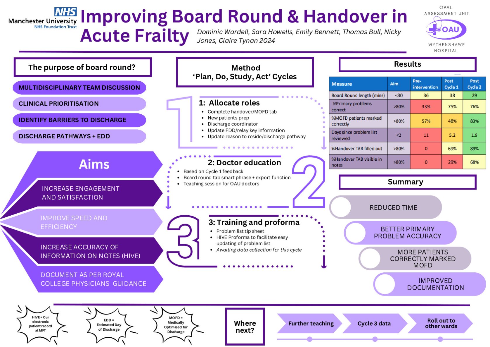 Data related to several outcomes was collected retrospectively over 4-5 days per cycle. Inclusion criteria included all inpatients on the acute frailty unit at the time of each daily morning board round. Qualitative data was collected at baseline and after cycle 1.