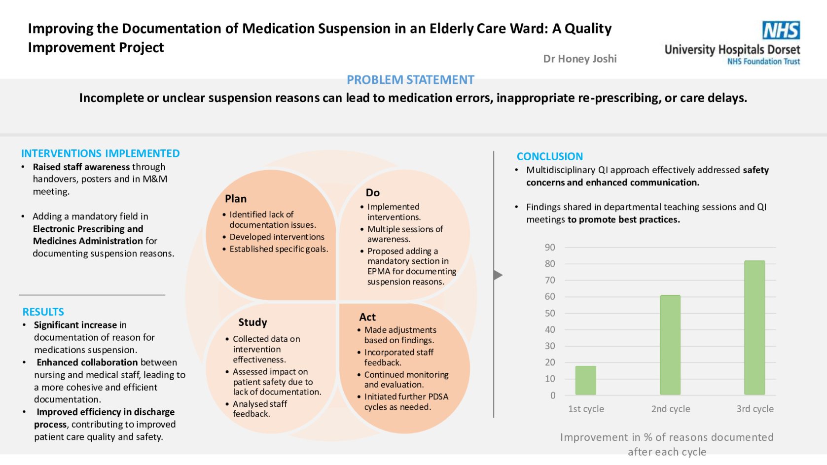 Methods: The project consisted of three cycles. In the first cycle, retrospective data from 29 patients showed 33 medications were suspended, with only 18% having a documented rationale. Following this, interventions were implemented, including raising staff awareness through handovers and posters displayed throughout the ward. These interventions aimed to highlight the importance of proper documentation in clinical practice. In the second cycle, data from 23 patients revealed 42 suspensions, but 24% still lacked documentation. Further steps included assigning responsibility to each clinical team member for ensuring proper documentation during their shifts. In the third cycle, data from 30 patients showed 82% of 31 suspended medications were documented appropriately. To address remaining gaps, a proposal was made to introduce a mandatory rationale field in the Electronic Prescribing and Medicines Administration (EPMA) system to ensure consistent and comprehensive documentation.