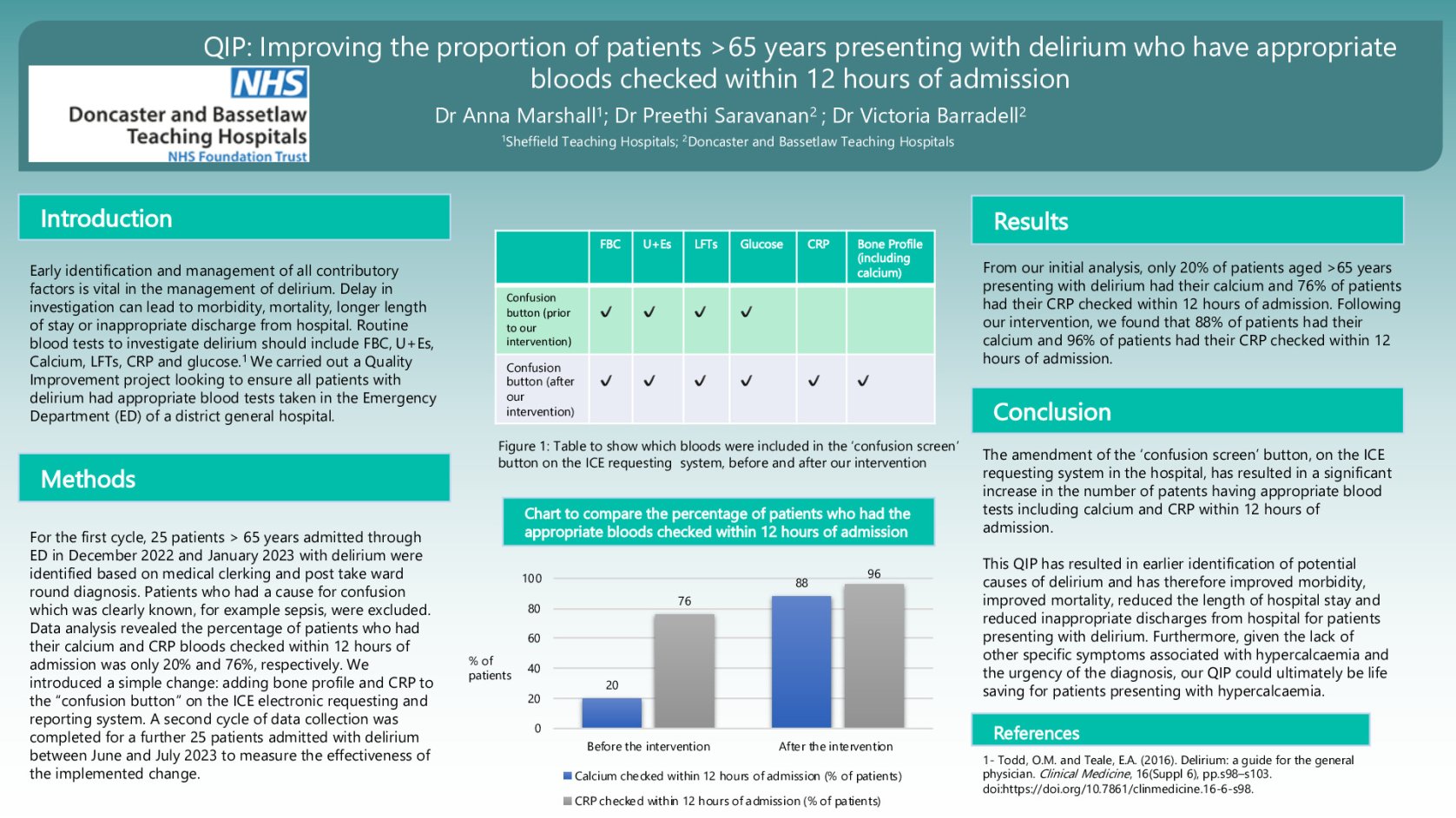 Methods: For the first cycle, 25 patients > 65 years admitted through ED in December 2022 and January 2023 with delirium were identified based on medical clerking and post take ward round diagnosis. Patients who had a cause for confusion which was clearly known, for example sepsis, were excluded. Data analysis revealed the percentage of patients who had their calcium and CRP bloods checked within 12 hours of admission was only 20% and 76%, respectively. We introduced a simple change: adding bone profile and CRP to the “confusion button” on the ICE electronic requesting and reporting system. A second cycle of data collection was completed for a further 25 patients admitted with delirium between June and July 2023 to measure the effectiveness of the implemented change.