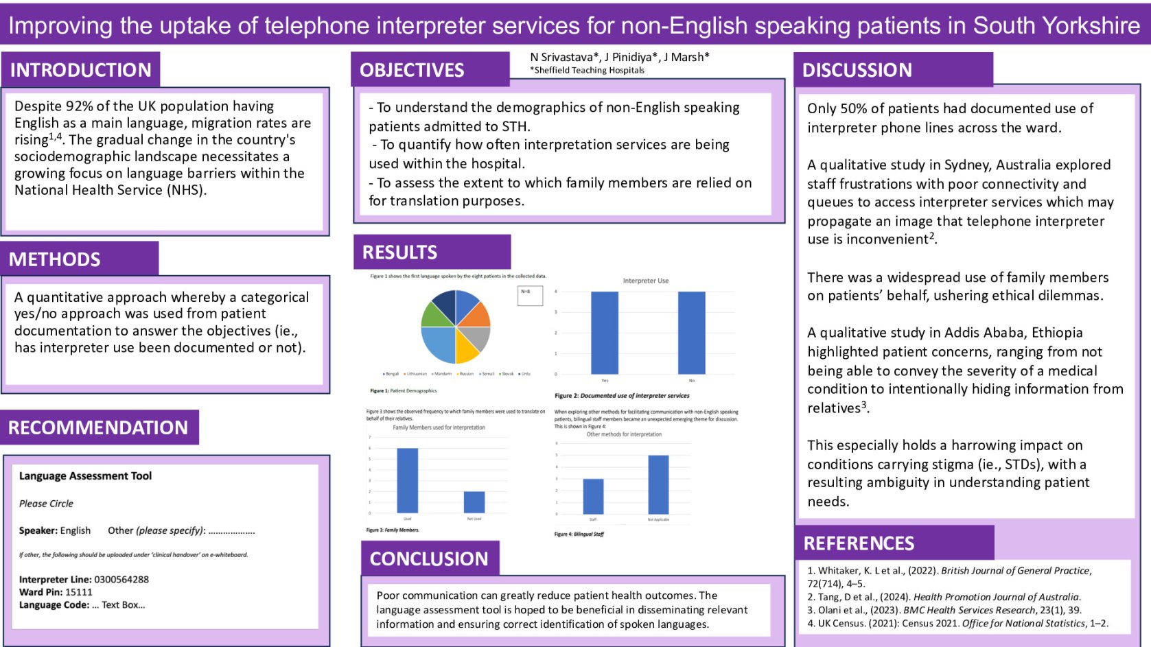Discussion: Barriers to interpreter services may be attributed to inefficiencies within its online nature, including queues and connectivity issues. This discourages its uptake, especially in the face of increasing hospital pressures. The high reliance on family members requires ethical considerations. These include issues with confidentiality, poor safety netting and disjointed communication of diagnoses when family members are used to translate. Ultimately, reliance on family members should be actively discouraged. This project recommends a language assessment tool and identification charts to guide NHS staff to appropriate interpreter services, preventing care delays.
