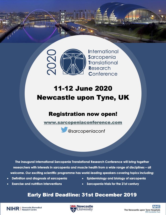 Given these exciting developments, it's a good time for a new conference. We are delighted to be holding the inaugural International Sarcopenia Translational Research Conference in Newcastle upon Tyne, UK on June 11th and 12th 2020. The conference, built around the theme “Where Worlds Meet”, will bring together a diverse range of practitioners and researchers from discovery science, sports science, exercise practitioners, clinical researchers and clinicians. We have a fantastic range of international speakers including Professor Miranda Grounds (discovery science), Professor Michael Kjaer (sports science), Professor Dawn Skelton (exercise) and Professor John Morley (drugs). There will be plenty of poster presentations, and workshops on new techniques to measure muscle mass, building research networks to tackle sarcopenia, and practical tips on how to give lifestyle advice to people with sarcopenia.
