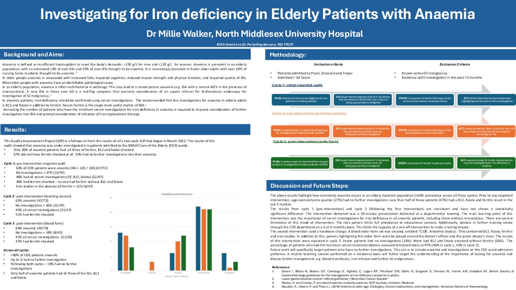 Methods: This quality-improvement project used the Plan, Do, Study, Act (PDSA) framework in three audit cycles, including care of the elderly inpatients (n=72) admitted at North Middlesex University Hospital (NMUH) for over 24 hours. Exclusion criteria were those with known GI malignancy or prior GI investigation within 12 months. The project assessed adherence to minimum recommended serum investigations for anaemia in older adults. Interventions included a departmental teaching session, a ‘COE anaemia bundle’ blood request form, and educational posters.