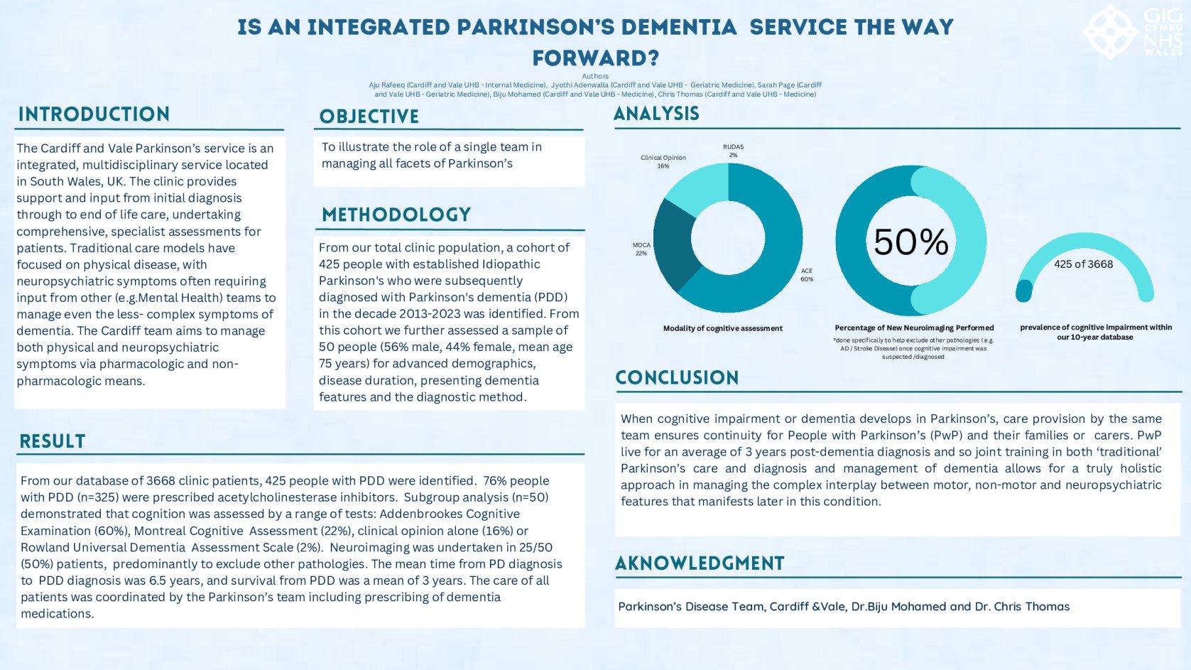 INTRODUCTION The Cardiff and Vale Parkinson's service is an integrated, multidisciplinary service providing support and input from initial diagnosis to end of life care, undertaking comprehensive, specialist assessments for patients. Traditional care models have focused on physical disease, with neuropsychiatric symptoms often requiring input from other (e.g. Mental Health) teams to manage even the less- complex symptoms of dementia. Our service aims to manage both physical and neuropsychiatric symptoms via non-pharmacologic and pharmacologic means.