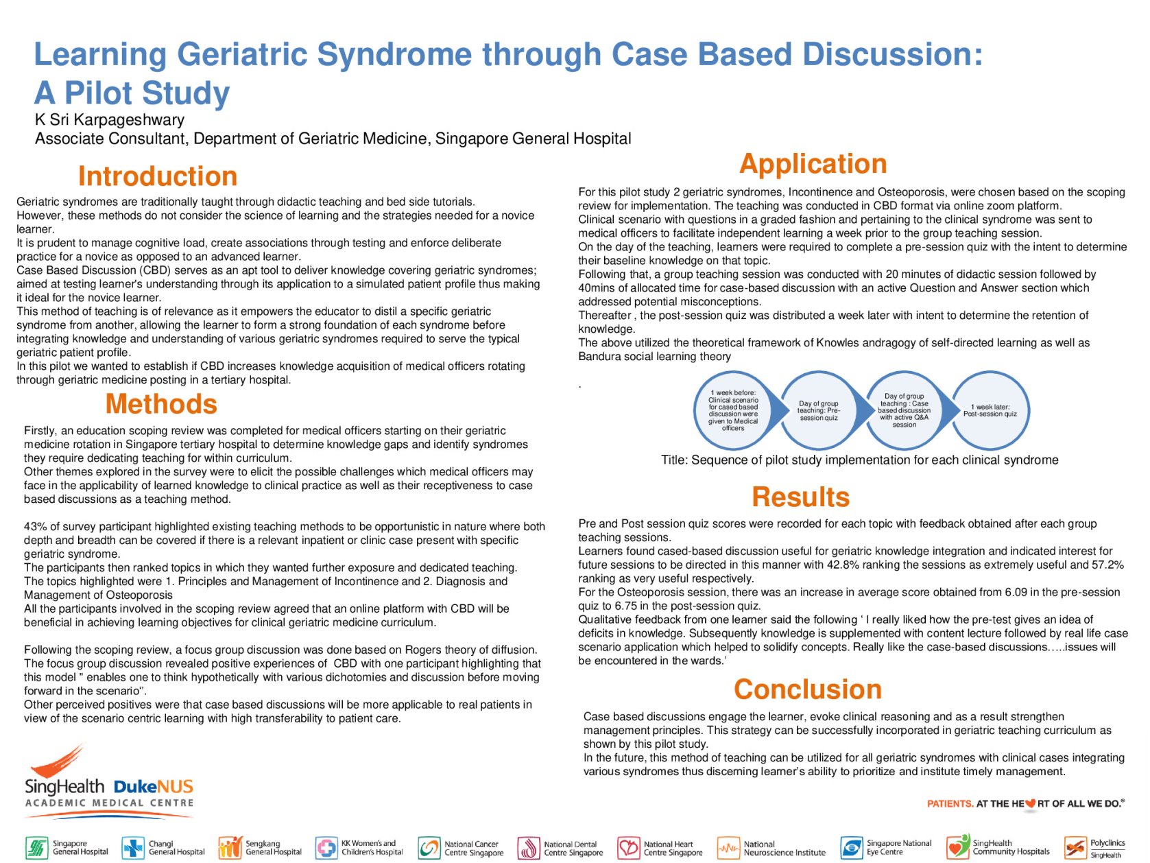 Quantitative Feedback received from the learners highlighted that more than 90% would want CBD to be implemented for other geriatric syndromes. There was an improvement in the average score obtained in post session quiz for Osteoporosis from 6.09 to 6.75. However, there was notably poor participation in the post session quiz.