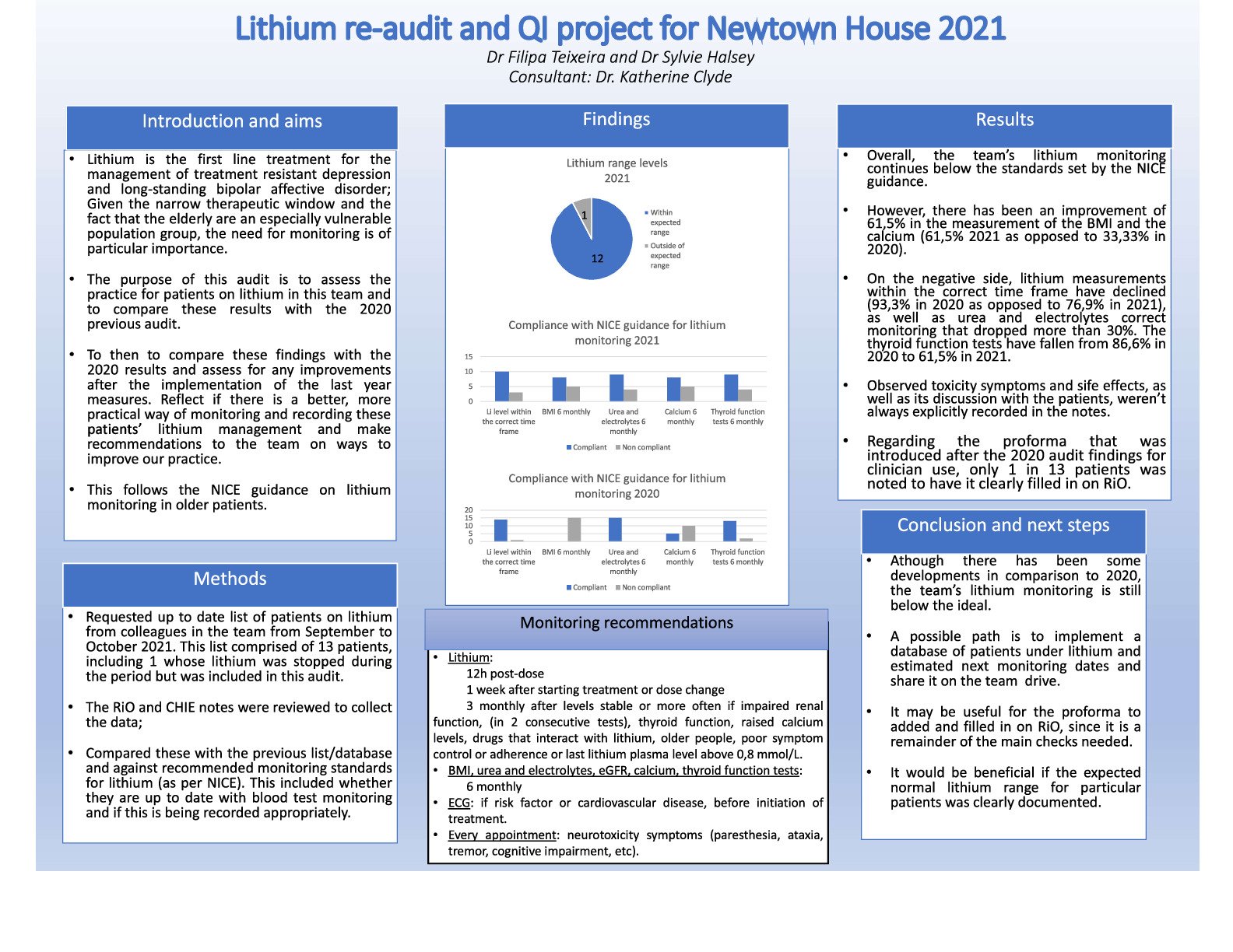 Lithium is the mainstay treatment for the management of treatment-resistant depression and long-standing bipolar affective disorder; Given the narrow therapeutic window and the fact that the elderly is an especially vulnerable population group, the need for monitoring is of particular importance. The purpose of this audit is to evaluate the practice for patients on lithium at an old age psychiatric community team and to compare these results with the 2020’s original audit. To then check for any improvements since the implementation of the last year’s measures and recommend changes. We requested an updated list of patients under lithium in our practice from September to October 2021. We then reviewed the ChiE and RiO notes and confronted these results with the recommended monitoring standards for lithium (NICE). We noticed that there was an improvement of 61,5% in the measurement of the BMI and the calcium (61,5% 2021 as opposed to 33,33% in 2020). However, lithium measurements within the correct time frame have declined (93,3% in 2020 as opposed to 76,9% in 2021), as well as urea and electrolytes monitoring that dropped more than 30%. The thyroid function tests have fallen from 86,6% in 2020 to 61,5% in 2021. Observed toxicity symptoms and side effects, as well as its discussion with the patients, weren’t always explicitly recorded in the notes. To conclude, although there have been some developments in comparison to 2020, the team’s lithium monitoring is still below the standards set by the NICE guidance. Recommendations were made, such as implementing a central database of patients taking lithium and due dates for the next monitoring on the team’s shared drive, for the proforma to be added and filled in on the system and if the expected normal lithium’s range for each patient was documented.