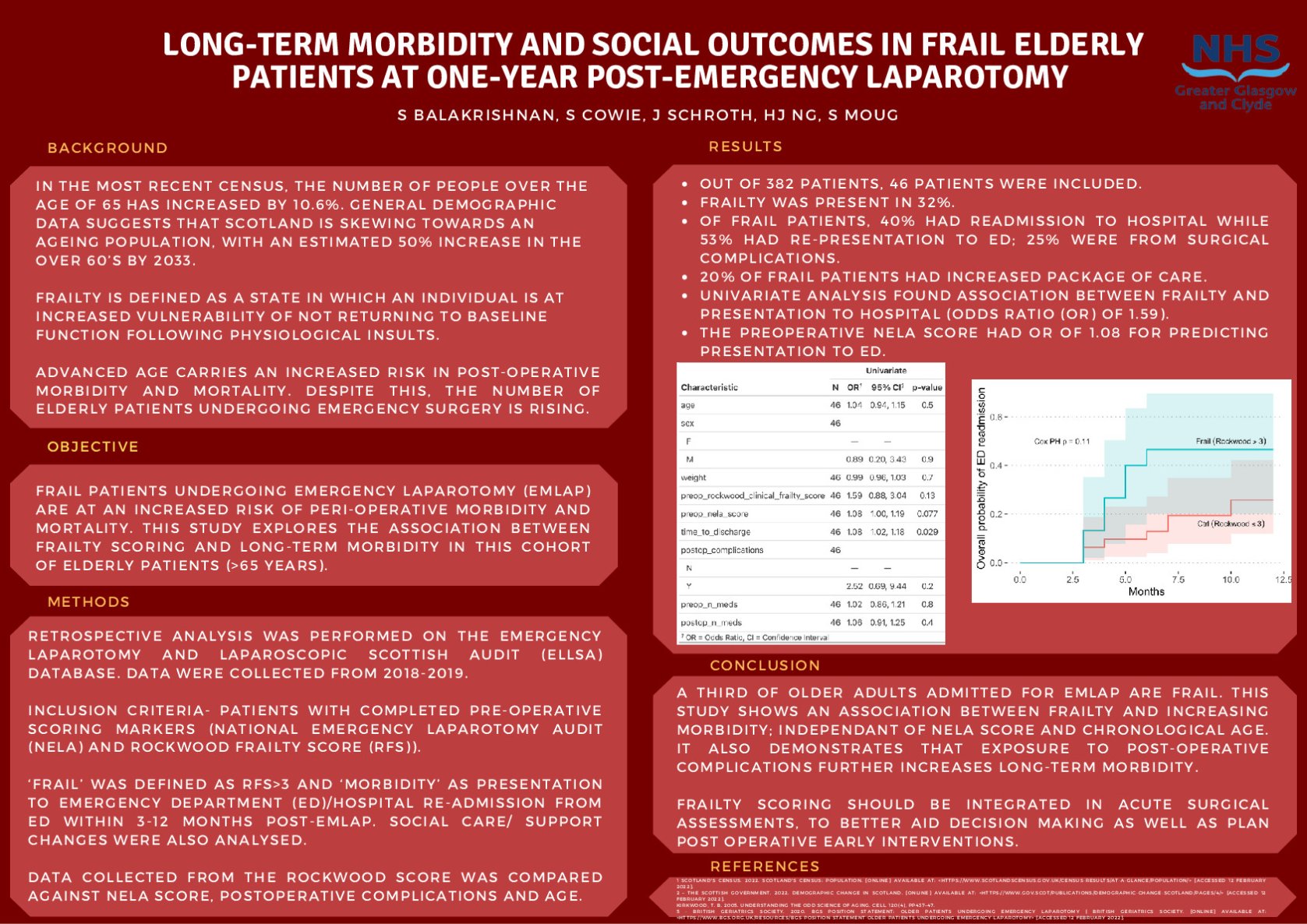 Retrospective analysis was performed on the Emergency Laparotomy and Laparoscopic Scottish Audit (ELLSA) database (2018-2019). Older adults with completed preoperative scoring markers (National Emergency Laparotomy Audit (NELA) and Rockwood Frailty Score (RFS)) were included. ‘Frail’ was defined as RFS>3 and ‘morbidity’ as presentation to Emergency Department (ED)/hospital readmission within 12 months post-EmLap. Social care changes include change in package of care (POC).