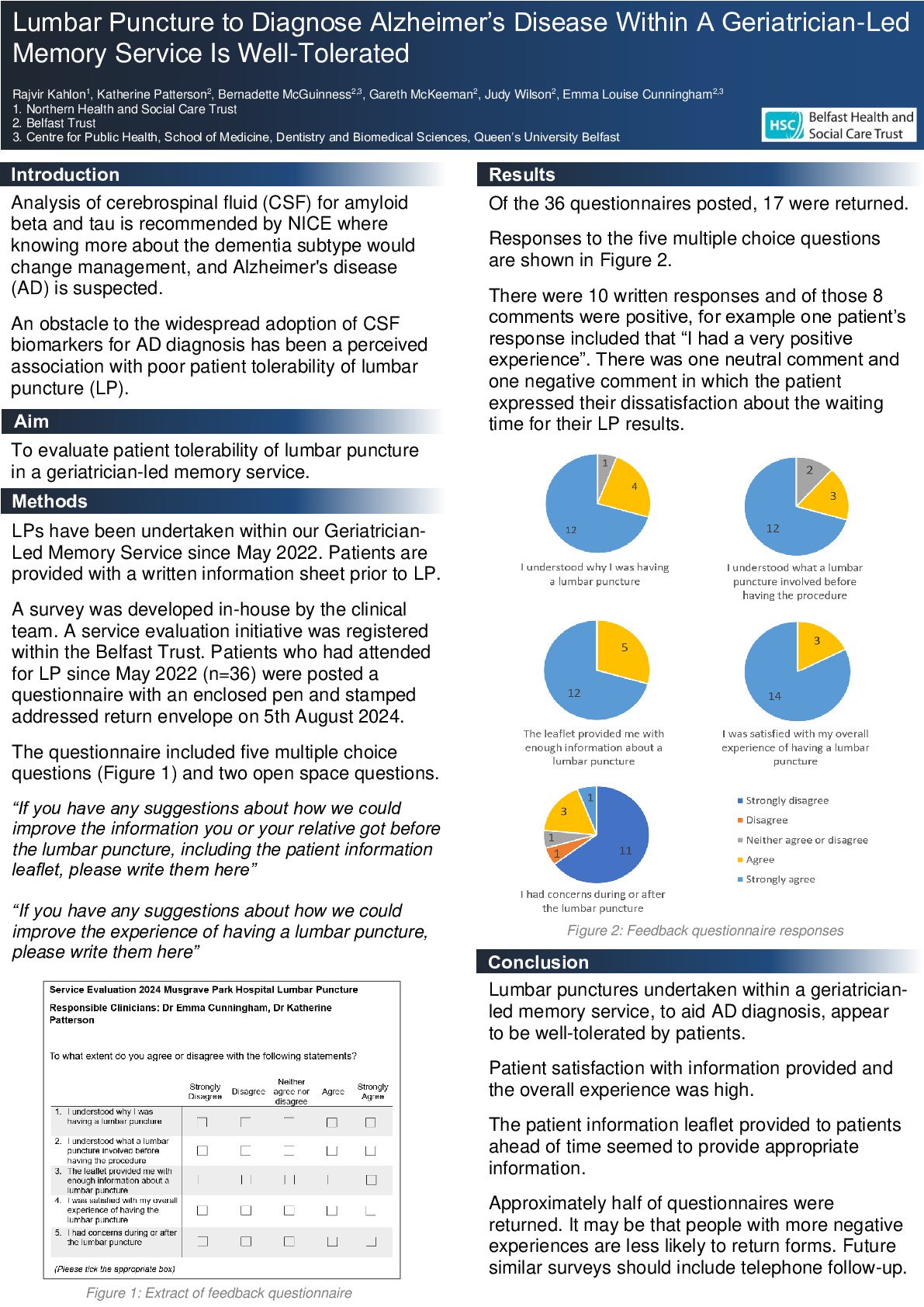 With the emergence of disease modifying treatments for Alzheimer’s disease (AD), there is an increasing emphasis on the earlier detection and diagnosis of AD. Cerebrospinal fluid (CSF) sampled using lumbar puncture (LP) can be used to establish a biological diagnosis of AD. One potential obstacle to the widespread adoption of CSF biomarkers for AD diagnosis has been a perceived association with poor patient tolerability and safety of LP. LPs have been undertaken within our Geriatrician-Led Memory Service since May 2022. Patients are provided with a written information sheet prior to LP.