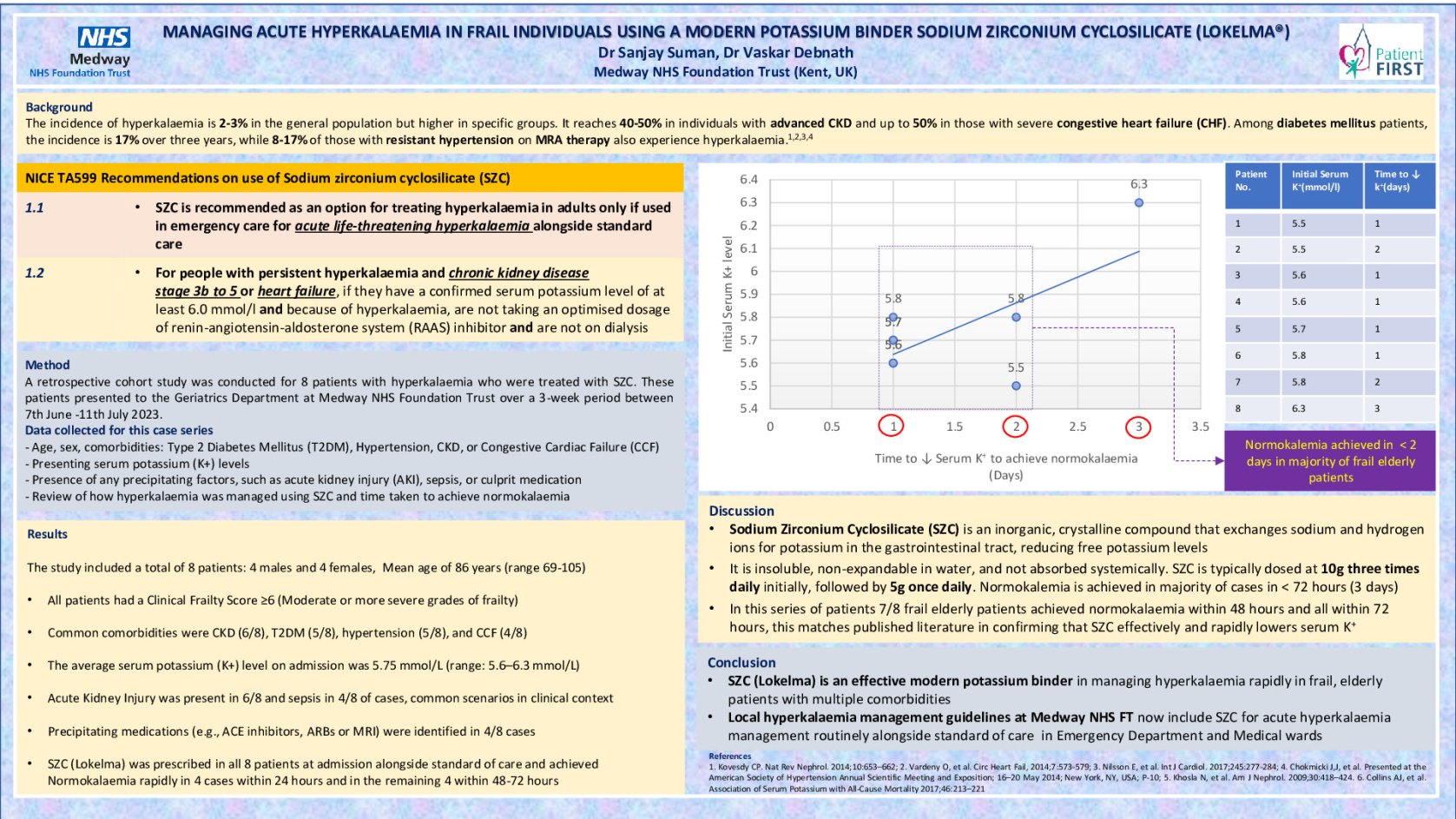 Eight patients presenting to ED at Medway NHS Foundation Trust over 3-week period between 7th June -11th July 2023 with Hyperkalemia were treated with SZC, data was collected retrospectively.