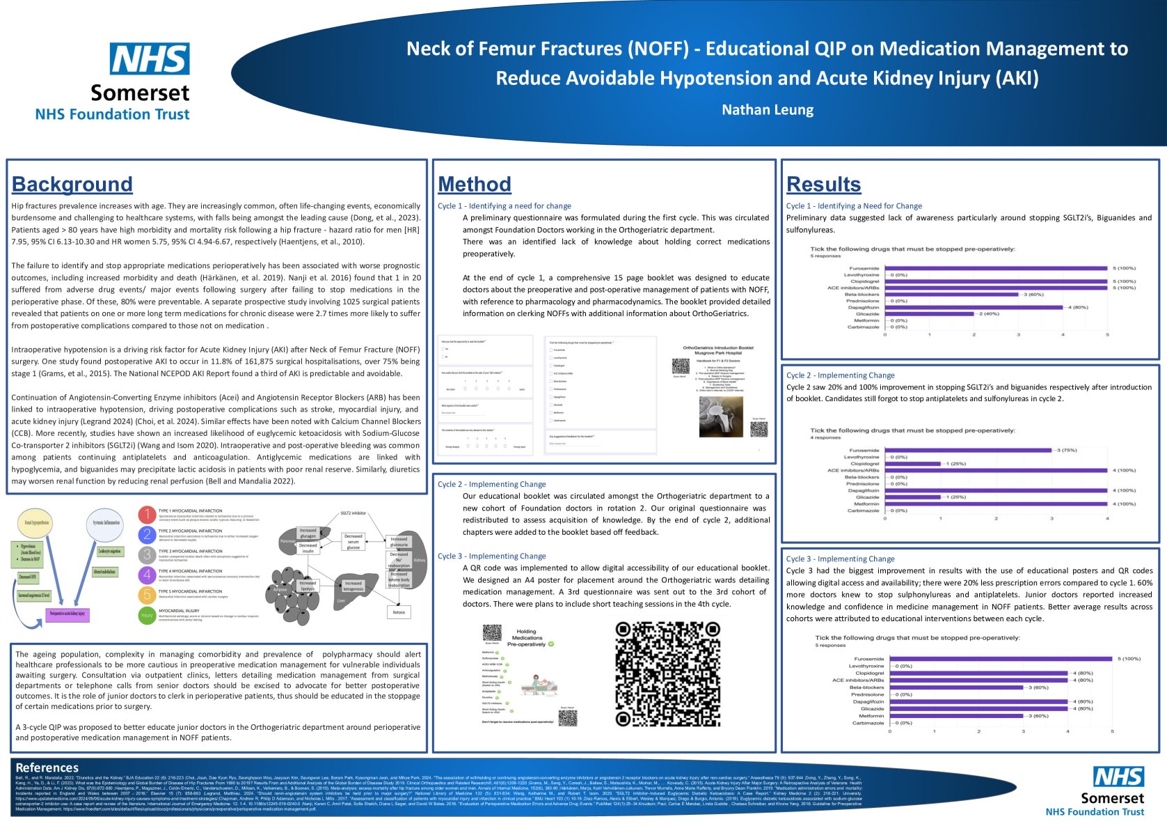This 3 cycle QIP identified al knowledge gap in junior doctors about stoppage of anti-hypertensives prior to NOFF surgery. Cycle 2 saw an improved stoppage of all classes of anti-hypertensives, especially angiotensin converting enzyme and angiotensin II receptor inhibitors, which particularly increase pre-renal AKI risk. There was 20% and 100% improvement in stopping SGLT2is and biguanides, respectively. Cycle 3 saw the biggest improvement following posters and QR code introduction. Additionally, 60% more doctors appropriately discontinued sulfonylureas and anti-platelets.
