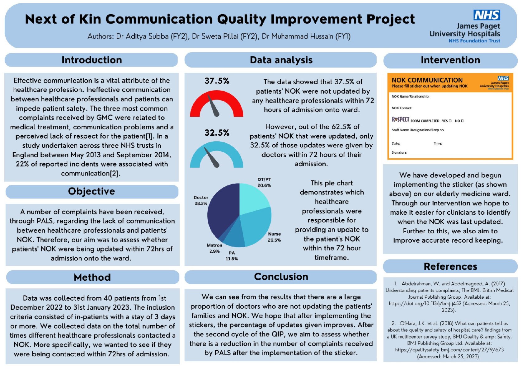 To conclude, the data collected has shown doctors only update 32.5% of patients’ NOK within 72 hours of ward admission. The intervention would be a sticker which is filled whenever communication between NOK and a healthcare professional occurs. The aim is to improve documentation; record-keeping and encourage updates within 72 hours. The aim is to re-collect in 2nd cycle and assess, eventually comparing the number of communication-related complaints received through PALS before and after the implementation of stickers.