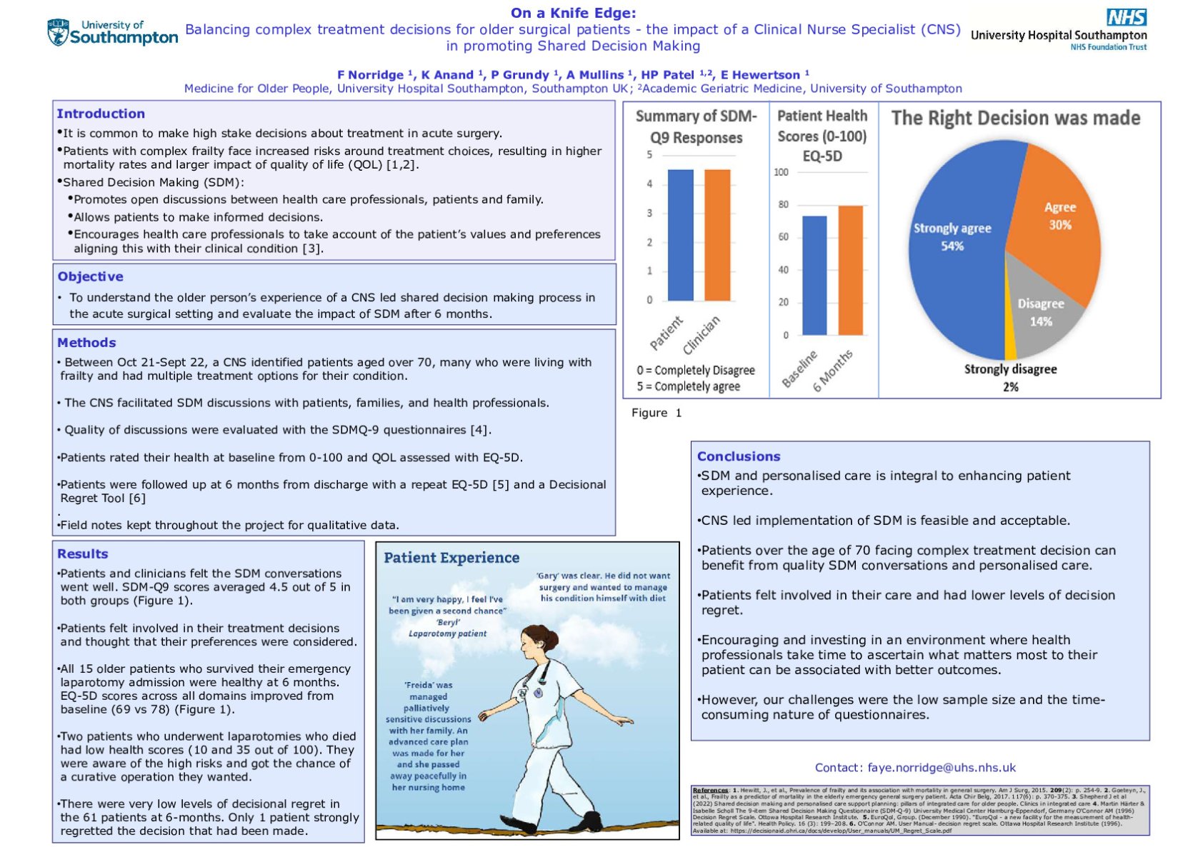 Methods Between October 2021 and September 2022, patients aged >70 years living with frailty admitted to the surgical unit were identified by an Older Persons Clinical Nurse Specialist (CNS). Involvement in treatment decisions was measured by using the patient and clinician SDM-Q9 questionnaire. Pre-admission as well as follow-up quality of life scores at 6 months using the EQ-5D-5L (0-100) as well as Decision Regret were obtained on subsets of patients.