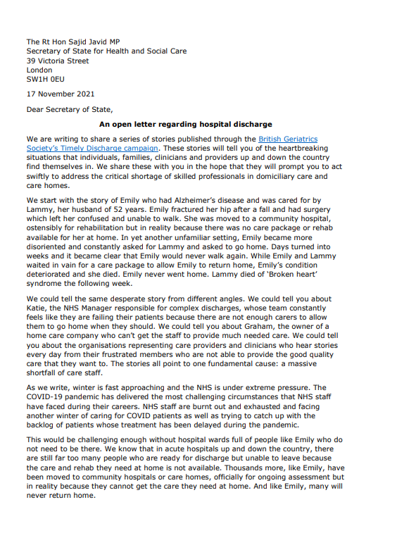 The letter highlights the stories shared through the British Geriatrics Society’s Timely Discharge campaign, illustrating the human impact on large numbers of older people in hospitals across the country who are medically fit for discharge but cannot access the care and rehabilitation they need to return home. A massive shortfall in available care staff means that older people are ending up stuck in hospital when they do not need to be there.