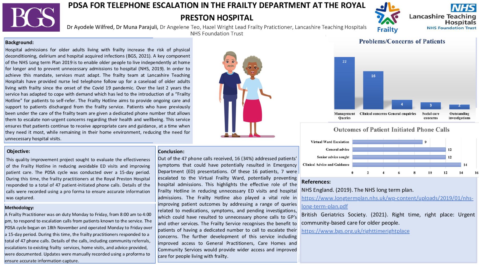 This quality improvement project sought to evaluate the effectiveness of the Frailty Hotline in reducing avoidable ED visits and improving patient care. The PDSA cycle was conducted over a 15-day period. During this time, the frailty practitioners at the Royal Preston Hospital responded to a total of 47 phone calls. Details of the calls were recorded using a pro forma to ensure accurate information capture.