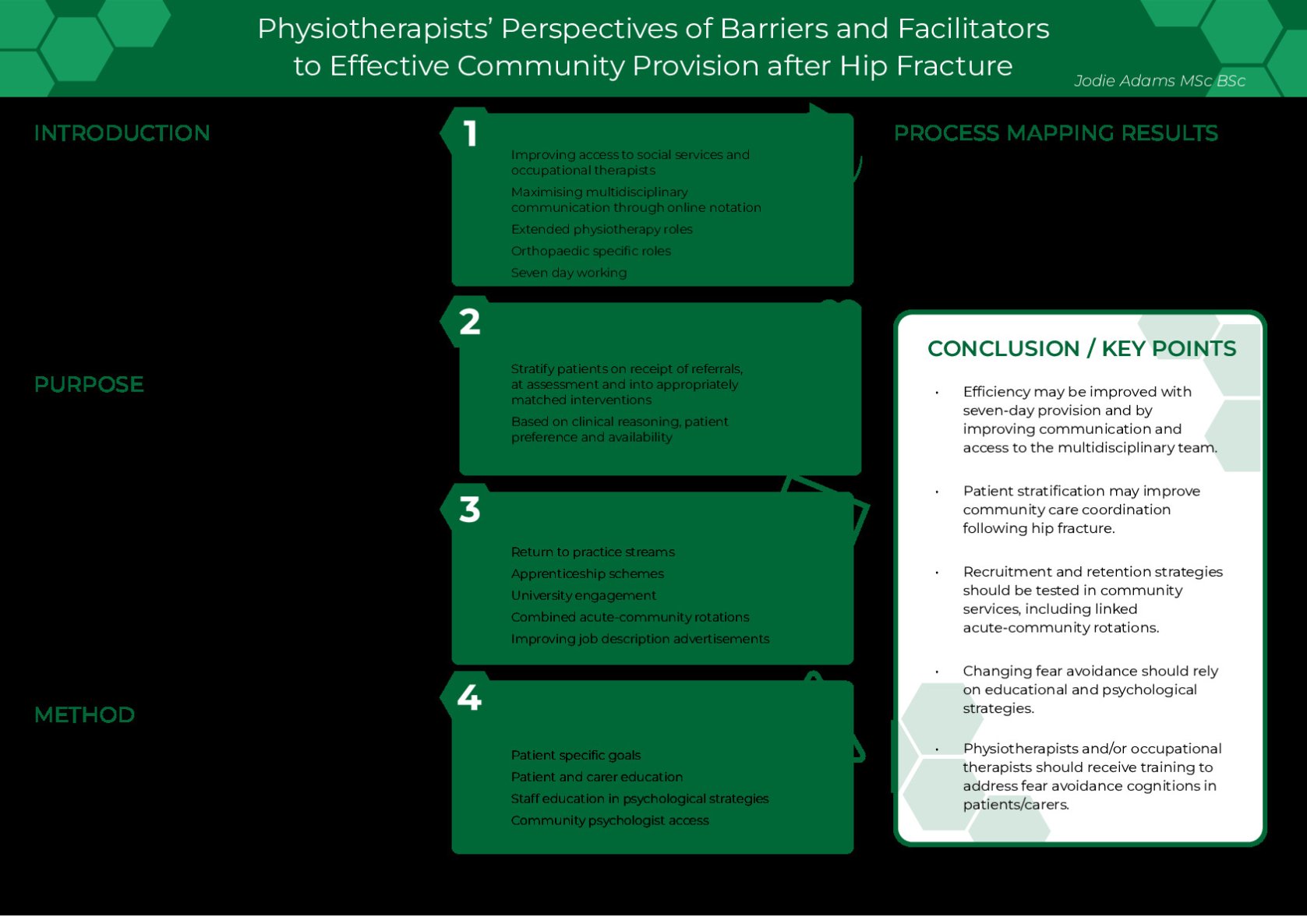 Physiotherapists propose that effective provision of community physiotherapy following hip fracture could be improved by refining care coordination, utilising stratification techniques, employing enhanced recruitment and retainment strategies and addressing fear avoidance behaviours.