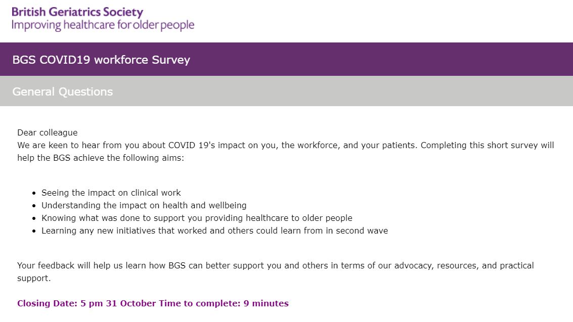 The BGS is keen to capture your experiences from the first months of the COVID pandemic in readiness for a second wave. Your resilience and wellbeing is important to the Society. By responding to this survey you will help us understand how the BGS can better support you, and provide information across different countries, settings and professions that we can analyse and report back to you.