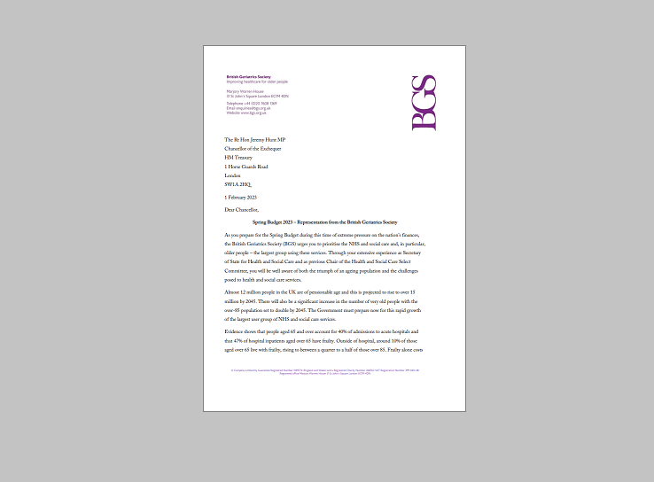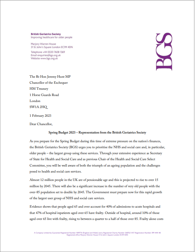 The BGS has submitted a written representation to England's Chancellor of the Exchequer, Jeremy Hunt, ahead of the Spring Budget. In this letter, we urge the Chancellor to prioritise investment in rehabilitation services, providing care closer to home, provision of healthcare in care homes and the health and social care workforce.