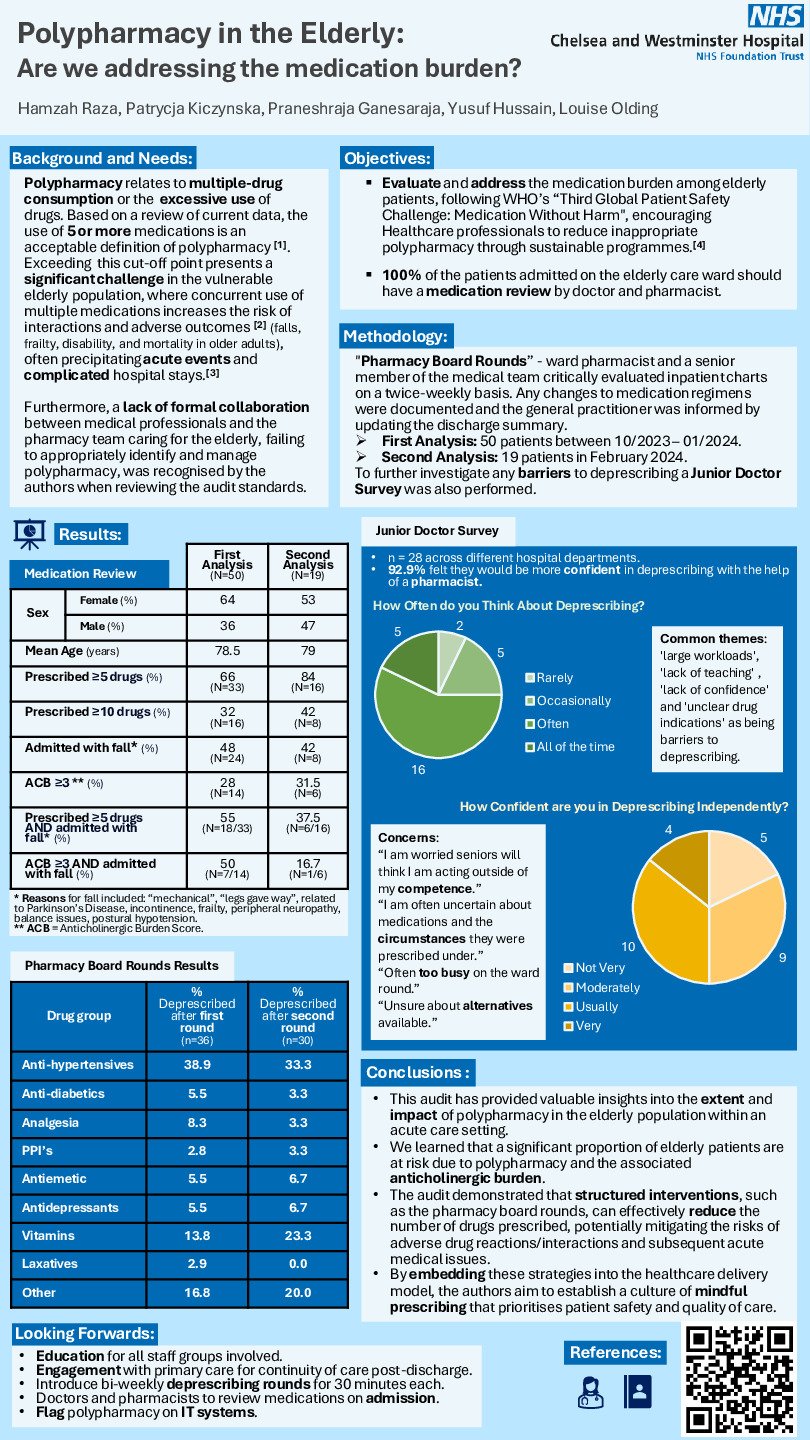 This project has been an enlightening endeavour, teaching us the critical nature of addressing polypharmacy. We have learned that interdisciplinary collaboration, regular medication reviews, and patient education are key to managing this complexity. To ensure long-term sustainability, we plan to institutionalize pharmacy board rounds and implement mandatory medication reviews. We aim to work closely with primary care to maintain continuity post-discharge. These efforts are expected to foster a culture of mindful prescribing and medication safety.