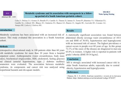 Introduction: Metabolic syndrome has been associated with an increased risk of cancer. This study evaluated this association in a South American cohort. Methods: Retrospective observational study in 100 patients older than 60 years with metabolic syndrome for more than 10 years from a hospital outpatient center. Anthropometric (waist circumference, body mass index), biochemical (triglycerides, HDL cholesterol, fasting glucose) and clinical (arterial hypertension, type 2 diabetes mellitus) parameters were evaluated. The association between metabolic syndrome, its components and cancer risk was