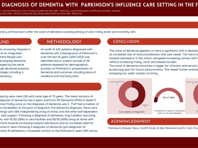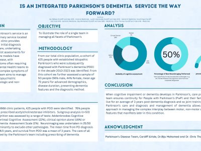 INTRODUCTION Dementia in Parkinsons is common and under-recognised with a significant impact on person and their carer. Contrary to other services, Cardiff and Vale Parkinson's services run an integrated Parkinson's clinic where People with Parkinsons (PwP) developing dementia continue to be managed by the same clinical team. METHODOLOGY An review of 425 patients diagnosed with dementia with a background of Parkinson's over last 10 years was undertaken. A random sample of 50 patients assessed for demographics, duration of Parkinson's, presentation of dementia and outcomes including place of