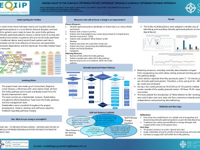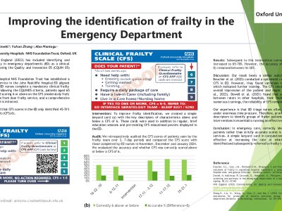 Introduction – NHS England have included the identification and response to frailty in emergency departments (ED) as an area of clinical priority, producing the CQUIN05. At the Oxford University Hospitals Trust (OUH) we have designed a front door frailty service and are participating in the CQUIN05 scheme. The Clinical Frailty Scale (CFS) score is recorded by nurses in ED. Following the CQUIN05 criteria, patients aged above 65 years old and scoring 6 or above on the CFS (moderately frail) are identified by the front door frailty service and a comprehensive geriatric assessment (CGA) initiated