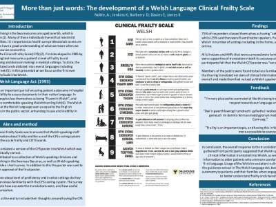 Swansea is one of oldest cities by population in the UK (more than 1 in 5 people over 65) leading to an increasing number of frail patients and has a high prevalence of Welsh speakers in the over 65 age group 12% of Swansea Bay employees identify as speaking Welsh. The Welsh language act awarded equal status to both English and Welsh, encouraging public bodies to publish official documents bilingually.As part of our work in developing frailty screening for elective surgical patients we use the clinical frailty score (CFS) and noted there was not a Welsh language version available. As we are