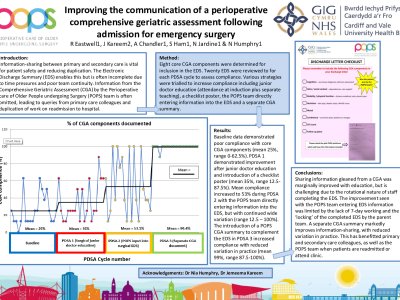 Introduction Information-sharing between primary and secondary care is vital for patient safety and reducing duplication. The Electronic Discharge Summary (EDS) enables this but is often incomplete due to time pressures and poor team continuity. Information from the Comprehensive Geriatric Assessment (CGA) by the Perioperative care of Older People undergoing Surgery (POPS) team is often omitted, leading to queries from primary care colleagues and duplication of work on readmission to hospital. Methods Eight core CGA components were determined for inclusion in the EDS. Twenty EDS were reviewed