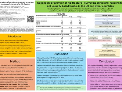 Introduction A quarter of people with hip fractures sustain another fragility fracture within 5 years, but most receive no osteoporosis medication as secondary prevention. To coincide with the publication of ‘A call to action: a five nations consensus on the use of intravenous zoledronate after hip fracture" Age and Ageing, September 2023, we set out to explore clinicians’ reasons for not previously using zoledronate (IV Zol). Methods Prior to first presentation of the ‘Call to Action’ at the Global Fragility Fracture Network (FFN) and British Geriatrics Society conferences in autumn 2023, we