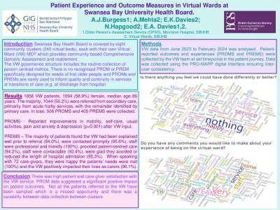 Introduction Swansea Bay Health Board is covered by eight community clusters (240 virtual beds), each with their own Virtual Ward (VW) MDT which provides community based Comprehensive Geriatric Assessment and reablement. The VW governance structure includes the routine collection of person centred metrics. There is no recognised PROM or PREM specifically designed for needs of frail older people and PROMs and PREMs are rarely used to inform quality and continuity in services at transitions of care (e.g. at discharge from hospital) Methods VW data from June 2023 to February 2024 was analysed