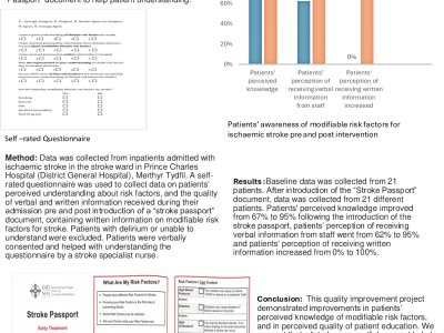 Introduction: Modifiable risk factors are an important part of secondary prevention of ischaemic stroke. Many of these are modifiable lifestyle choices. We identified a lack of provision of written information to patients on the stroke ward regarding modifiable lifestyle risk factors, and undertook a quality improvement project which aimed to improve provision of information - both written and verbal - via a "Stroke Passport" document to help patient understanding. Method: Data was collected from inpatients admitted with ischaemic stroke in the stroke ward in Prince Charles Hospital (District