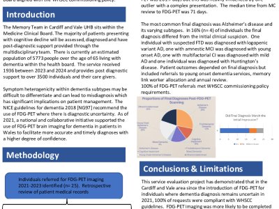 Introduction: Symptom heterogenicity in dementia subtypes can pose diagnostic challenges, leading to potential misdiagnoses and significant implications on patient management. The NICE Guidelines for Dementia 2018 [NG97] recommend FDG-PET where diagnostic uncertainty remains after initial assessment. From 2021, a national and collaborative initiative supported using FDG-PET brain imaging for dementia in Wales to facilitate more accurate and timely diagnoses with higher degrees of confidence. This project aimed to evaluate the temporal aspects and diagnostic accuracy of FDG-PET utilization in