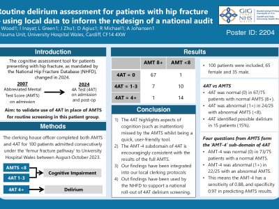 Introduction The National Hip Fracture Database (NHFD) is the mandatory national clinical audit for patients presenting with hip fracture. Since 2007, the NHFD has made admission cognitive assessment using the Abbreviated Mental Test Score (AMTS) routine for people presenting with this injury. In 2024, the NHFD plans to replace the AMTS with the 4A test (4AT), so all patients are additionally assessed for delirium on presentation. This study aims to compare the AMTS and 4AT for this patient group, so the NHFD and our local team can anticipate the consequences of this change in patient