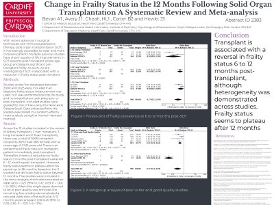 Introduction With recent advances in surgical techniques and immunosuppressive therapy, solid organ transplantation (SOT) is increasingly accessible to older and more complex patients. Multiple previous studies have shown quality of life improvements in SOT patients post-transplant across age group and despite significant pre-transplant frailty. As such, we are investigating if SOT is associated with a reduction in frailty status post-tranplant. Methods Studies across five databases between 2000 and 2023 were included if an objective frailty status measurement was used, SOT was performed