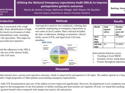 Aim Emergency laparotomy is associated with a high mortality and morbidity. Early identification of high-risk patients allows for timely involvement of other members of the multidisciplinary team, including care of the elderly (CoE) specialists. This improves the likelihood of a successful post-operative recovery. This study investigated the adherence to the NELA guidelines regarding the use of the clinical frailty score and input from the CoE team. Methods A prospective analysis was conducted, collating data on patients undergoing an emergency laparotomy in one centre in East London. Data