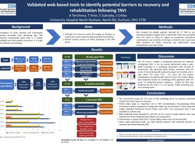 Introduction: Prevalence of aortic stenosis and comorbidity burden correlates with advancing age. The Charlson Comorbidity Index (CCI) is a widely validated tool that predicts outcomes in a range of conditions and settings. Methods: We analysed 38 eligible patients referred for CT TAVI at our institution between August 21 - December 22 and calculated their CCI score to study its impact on symptoms, procedural complications and mortality at 30-days, 6-months and 1-year post TAVI. Evidence of frailty screening was determined using retrospective case note review. Results: Thirty-eight patients
