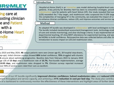 Introduction Hospital-at-Home (HaH) is an innovative care model delivering hospital-level care to community patients. A key priority for Bromley HaH has been to streamline strategies, providing integrated, individualised care for patients with heart failure (HF). Our study revealed that our length of stay (LOS) exceeded the 7-day target, and readmission rates surpassed the 0-10% target. Recognising the complexities of managing HF in the community, we evaluated the impact of a new HF bundle to enhance clinician confidence, reduce LOS, and improve outcomes and service capacity. Method An adapted