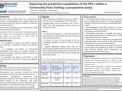 Introduction: Concerns about falling (CaF) is a psychosocial concept, precipitating a spiral of increasing inactivity, social isolation and falls, and is common in those who have experienced, or are at risk of, a fall. One method of assessing CaF is the Falls Efficacy Scale International version (FES-I),with previous studies finding associations between higher FES-I scores and poor scoring on commonly used clinical assessments of functional mobility and balance (Gait speed (GS), Timed up and Go test (TUG), and Five time sit to stand (FTSS)). Using the FES-I to predict poor functional mobility