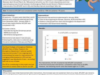 Introduction: Falls account for 17% of emergency department (ED) attendances and cause significant morbidity and mortality in older people. An accurate falls risk assessment can identify those at risk of inpatient falls. At Northumbria Healthcare NHS Foundation Trust, the ‘Avoiding Falls Level of Observation Assessment Tool’ (AFLOAT) was developed to identify patients requiring higher levels of observation to prevent falls (Richardson DA. ClinMed (Lond). 2020; 20(6): 545-550). Whilst AFLOAT was commonly used for inpatients, it was rarely completed in ED. A multi-disciplinary and inter
